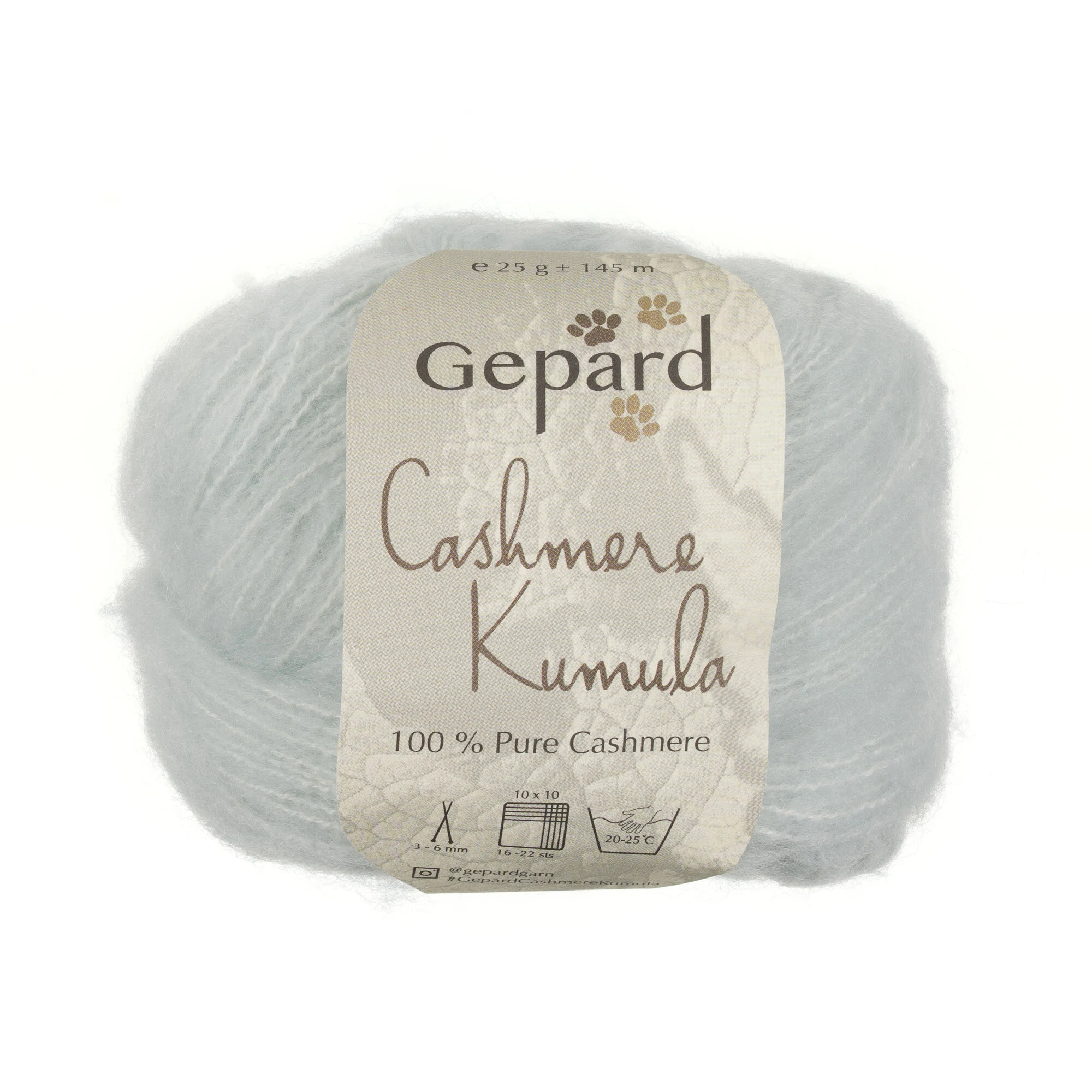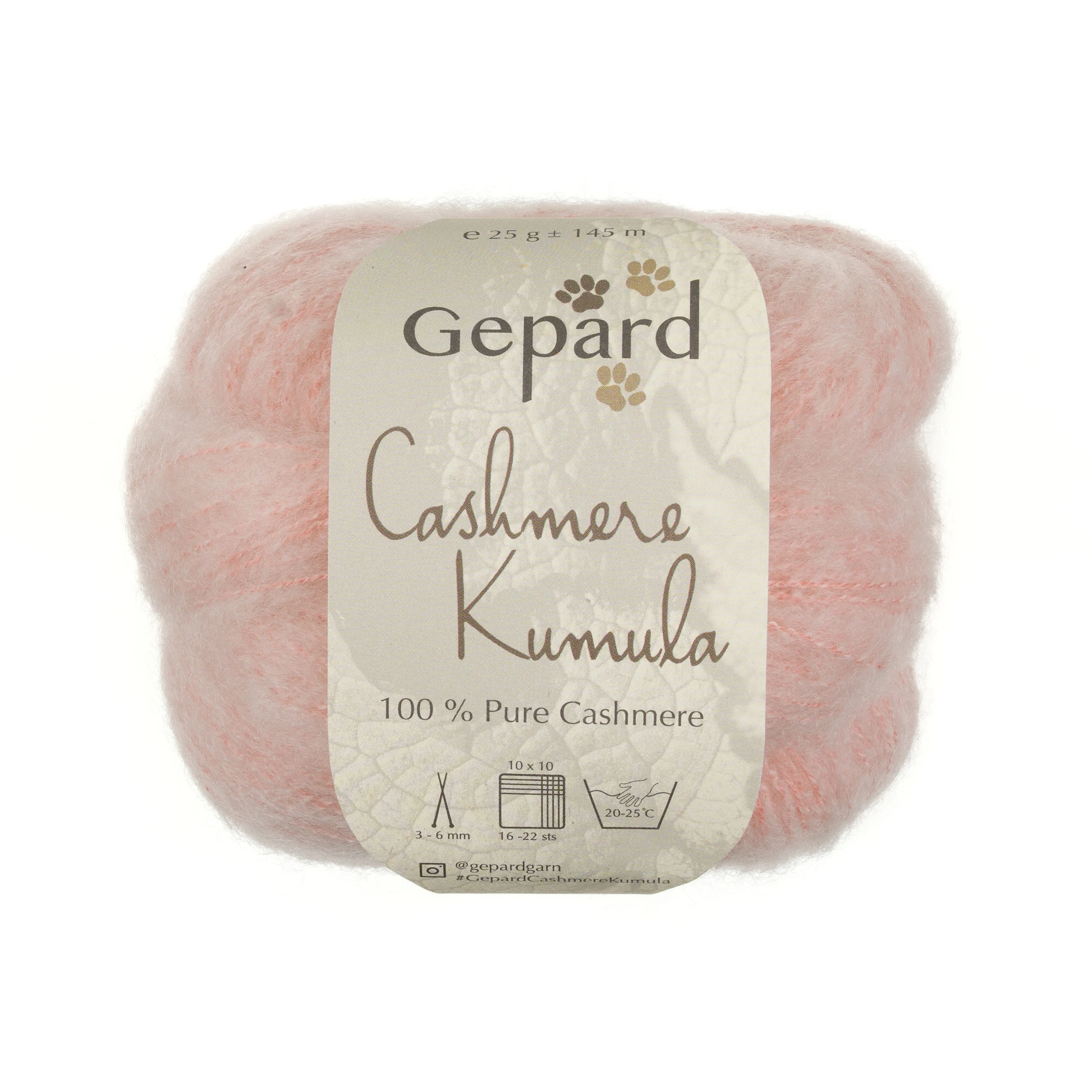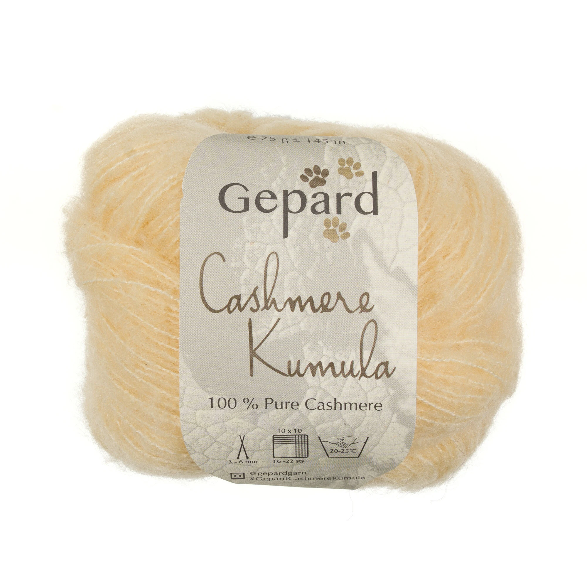 Cashmere Kumula er cashmere i sin smukkeste form: et garn, hvor luksus og anvendelighed går hånd i hånd. Garnet er spundet med en tynd kernetråd af cashmere, som de lange, fine cashmerefibre er flettet ind omkring. Gepard har testet andre muligheder som kernetråd (silke, uld), men kun cashmere-kernetråd gav det resultat, de dygtig Gepard folk ønskede: en garnstruktur, der er både blød, uhørt fleksibel og formfast – og som lader strikken falde med et vidunderligt blødt og smidigt fald.