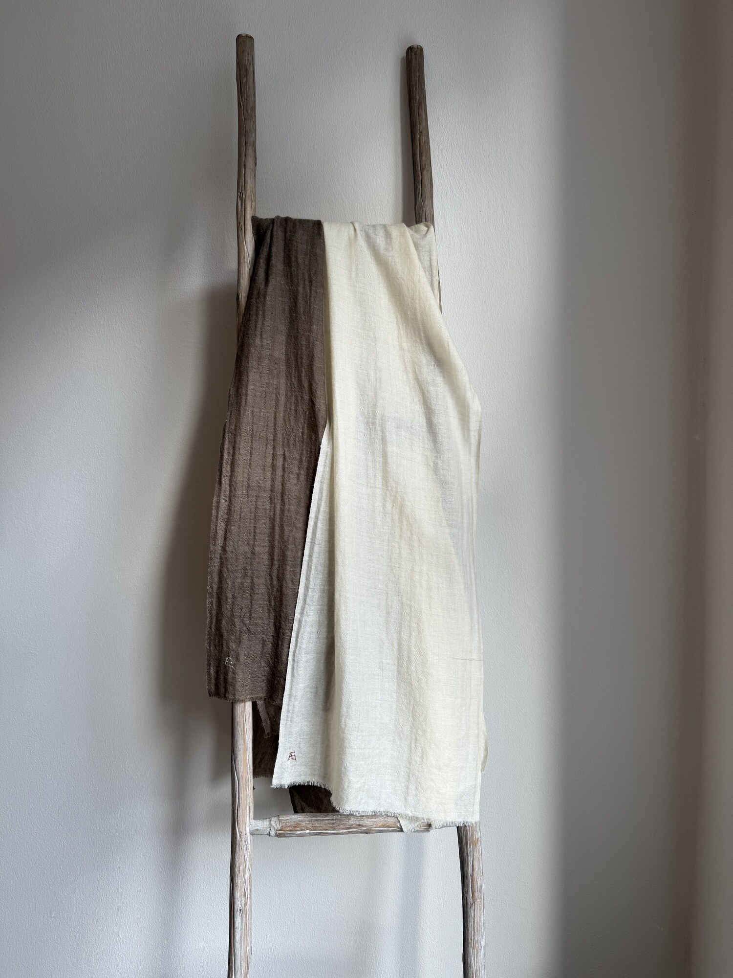 De her tørklæder er lavet af 100 % cashmere fra det bjergrige og kolde Kashmir, hvor fibrene bliver håndspundet og håndvævet hos en familie – præcis som man har gjort det i generationer. Farverne er cashmere gedernes naturlige farver, som får lov at være helt rene og ubehandlede. Det er i Kasmirbjergene at cashmere oprindelig stammer fra og siden er spredt ud til især Kina og Mongoliet. Den cashmere tørklæderne er håndspundet af er den fineste både mht. blødhed og styrke, den koster også det dobbelte som råuld, i forhold til cashmere fra Kina og Mongoliet.